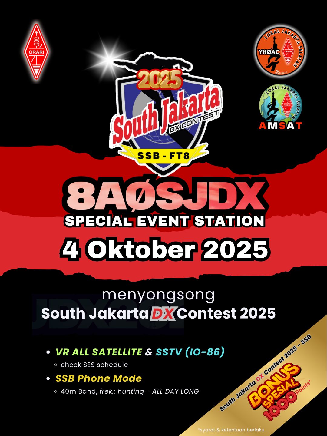 Sebagai rangkaian kegiatan South Jakarta DX Contest 2025, ORARI Lokal Jakarta Selatan akan mengadakan Special Event Station dengan callsign 8A0SJDX. Special Event Station ini akan diadakan pada tanggal 4 Oktober 2025, mulai jam 00:00 – 15:00 UTC (07:00 – 22:00 WIB)